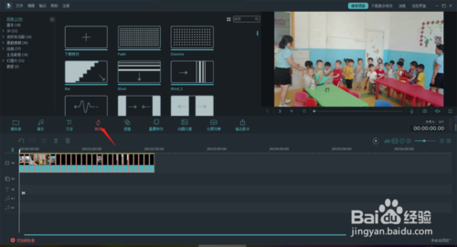 5、加好轉(zhuǎn)場后現(xiàn)在我們就把準(zhǔn)備好的音樂也加上去。直接拖到音頻軌上就行。