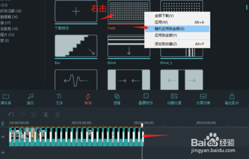4、現(xiàn)在我們給照片加轉(zhuǎn)場動畫,一張張肯定很麻煩的,不過有個簡單的方法,首先進(jìn)入轉(zhuǎn)場界面,你會看到有很多轉(zhuǎn)場效果。隨便右擊一個轉(zhuǎn)場動畫,選擇隨機(jī)應(yīng)用到全部。完成后我們就可以在視頻軌道上看到我們的照片已經(jīng)加上了轉(zhuǎn)場動畫。你也可以在預(yù)覽框中預(yù)覽一下加好轉(zhuǎn)場的圖片。