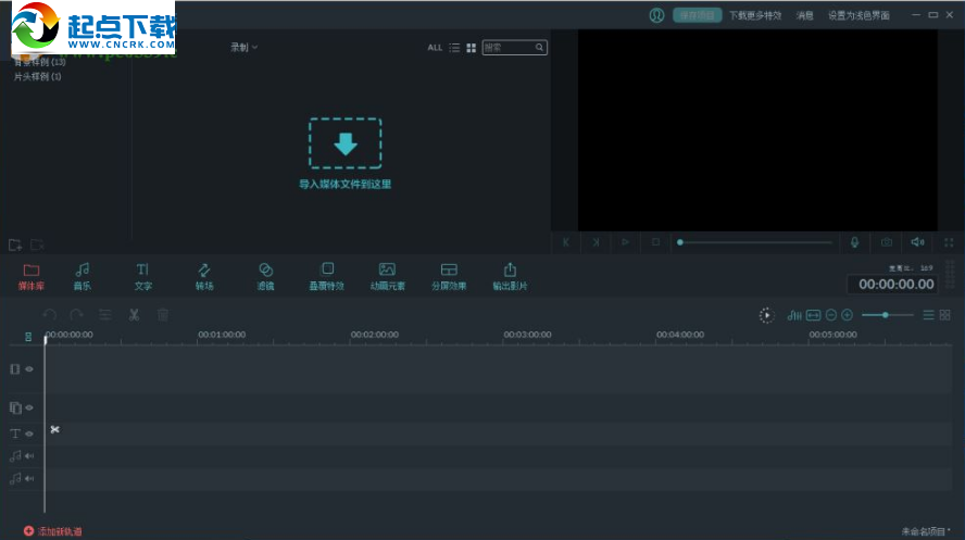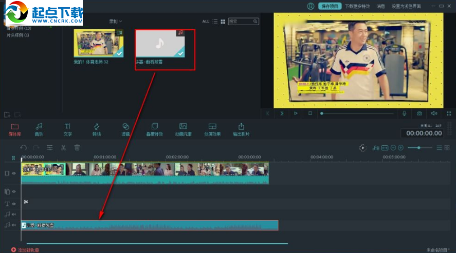 9、若用戶需要將本地音樂作為背景音樂,可以直接在媒體庫中導(dǎo)入音樂文件,然后拖動文件到音軌時間軸上,設(shè)置完成后我們進(jìn)行導(dǎo)出即可。