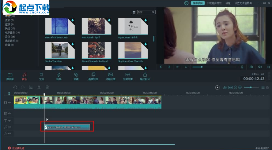 7、用戶可以通過左右移動音軌時間軸對應(yīng)相依的視頻時間軸(設(shè)置音樂對應(yīng)的視頻的位置)。