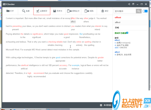易改基于人工智能開發(fā)了糾錯(cuò)引擎,可以智能地發(fā)現(xiàn)已有英語文本中的錯(cuò)誤,提高成文質(zhì)量。 同時(shí)易改客戶端也集成了詞典和整句翻譯工具可以在寫作時(shí)使用。