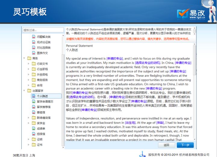 都知道英語寫作在考試比分中占了很大部分,易改英語寫作軟件是全球最領(lǐng)先的英語寫作校對軟件,提供寫作錯(cuò)誤解釋、整句翻譯、雙詞對比等輔助查詢,大大提高我們的英語寫作水平。錯(cuò)誤歷史統(tǒng)計(jì)和錯(cuò)誤詞匯統(tǒng)計(jì)您可以在“用戶中心”欄目內(nèi)的“糾錯(cuò)歷史”中查看您的錯(cuò)誤統(tǒng)計(jì)和詞匯統(tǒng)計(jì)。易改會為您記錄糾錯(cuò)歷史和詞匯水平,以方便您更有針對性地提高英語水平。