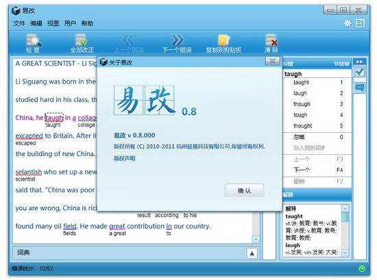 "易改"是由杭州硅易科技有限公司自主研發(fā)的一款基于云計(jì)算的免費(fèi)英語寫作輔助軟件。通過易改的幫助,您可以便捷高效地進(jìn)行英語文本拼寫校對、語法糾錯(cuò)和風(fēng)格潤色,更有錯(cuò)誤解釋和詞典等功能來協(xié)助您更快速改正錯(cuò)誤、提高寫作質(zhì)量。目前該軟件處于公測階段,歡迎大家體驗(yàn)。