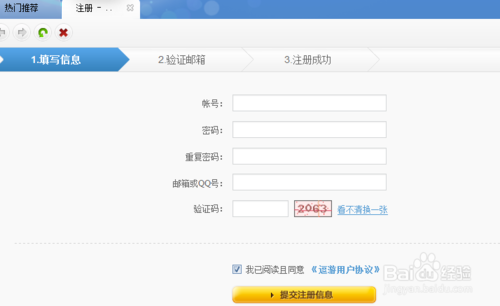 點(diǎn)擊【注冊(cè)】按鈕,頁(yè)面進(jìn)行跳轉(zhuǎn),來(lái)到了注冊(cè)賬號(hào)的第一步:填寫(xiě)信息。我們需要填寫(xiě)的信息,主要有賬號(hào)、密碼、郵箱/QQ號(hào)、驗(yàn)證碼,并且在“我已閱讀且同意《逗游用戶協(xié)議》”前打鉤。