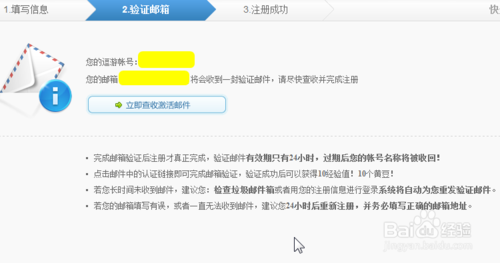 所有的信息填寫(xiě)完畢之后,點(diǎn)擊最底下的【提交注冊(cè)信息】按鈕,頁(yè)面跳轉(zhuǎn)到用戶注冊(cè)的第二步——驗(yàn)證郵箱。官網(wǎng)會(huì)發(fā)送一封驗(yàn)證郵件到您剛剛填寫(xiě)的郵箱地址里。