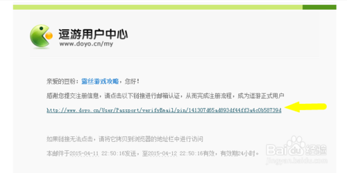 打開(kāi)收件箱,第一封郵件,就是逗游用戶中心發(fā)給我們的驗(yàn)證郵件,點(diǎn)擊下圖中的鏈接,完成注冊(cè)。