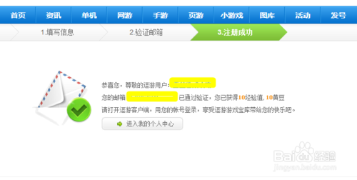 第三步,也是最后一步,完成注冊(cè)。點(diǎn)擊驗(yàn)證鏈接之后,系統(tǒng)會(huì)發(fā)來(lái)祝賀注冊(cè)成功的信息,并獲得10經(jīng)驗(yàn)值和10個(gè)黃豆。逗游游戲?qū)殠?kù)和網(wǎng)頁(yè)都是同步的,在逗游游戲?qū)殠?kù)里注冊(cè),就是在逗游官網(wǎng)上注冊(cè)。
