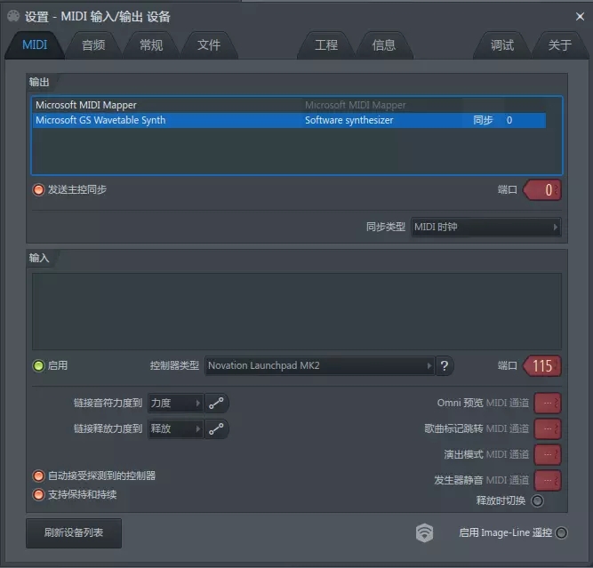 首先打開軟件 FL Studio 20,在菜單欄選項中,打開 MIDI 設(shè)置(或使用快捷鍵 F10),彈出“設(shè)置-MIDI 輸入/輸出設(shè)備”,在 MIDI 下,輸出設(shè)備右下角的端口設(shè)置為 116。輸入設(shè)備下方的控制器類型選擇 Novation Launchpad MK2,端口設(shè)置為 115。