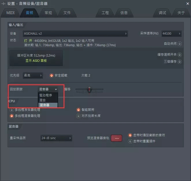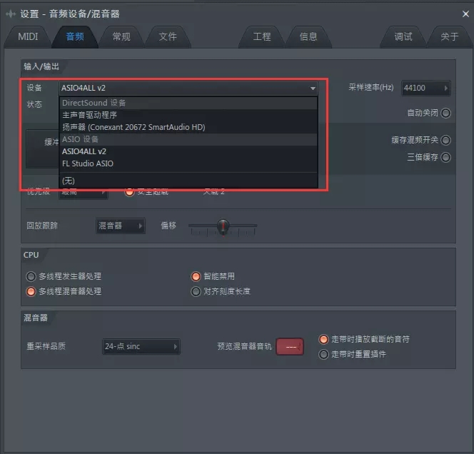 我們發(fā)現(xiàn)使用 FL Studio 軟件自帶的 ASIO4ALL v2和 FL Studio ASIO 就不會出現(xiàn)此情況,應(yīng)該是外置聲卡問題。