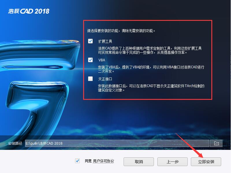 在選項(xiàng)頁面中用戶可以選擇是否安裝VBA(32位可選,64位暫不支持VBA)或天正接口還有擴(kuò)展工具。
