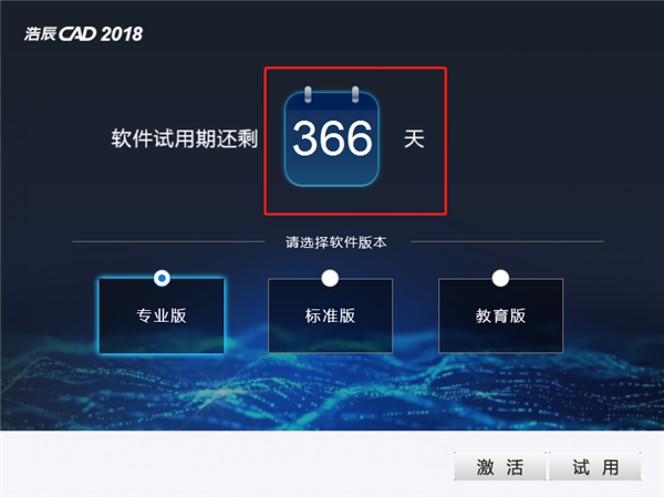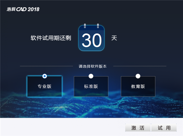 2、安裝完成后先運(yùn)行軟件,發(fā)現(xiàn)只有30天的試用期。別擔(dān)心,先選擇你想試用的版本,選擇試用。有專業(yè)版,標(biāo)準(zhǔn)版,教育版。