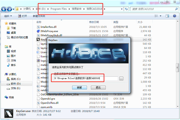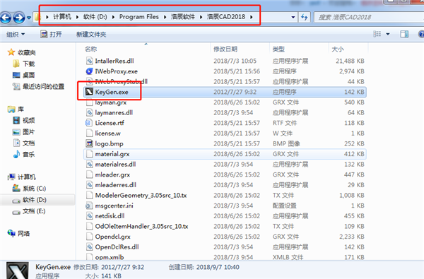 4、將破解工具KeyGen.exe放到軟件的安裝目錄。(小編將軟件安裝在了D:\Program Files\浩辰軟件\浩辰CAD2018)