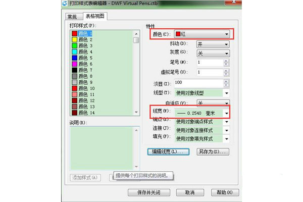 2、選擇新建可以新建一個(gè)pcp或者ctb打印樣式。也可以自行設(shè)置打印樣式或調(diào)整打印樣式表參數(shù)。在打印樣式對話框中可設(shè)置相關(guān)參數(shù),如顏色、線寬等。
