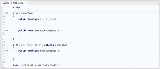 如果您正在處理遺留代碼庫并想要清理事物,那么開始的一個好方法就是刪除死代碼?,F(xiàn)在,PhpStorm檢測冗余代碼并突出顯示可能從未使用過的類,類成員和函數(shù)。該 未使用的聲明檢查考慮到代碼的帳戶動態(tài)用途,例如經(jīng)由魔術(shù)方法。要檢查報告為整個項目中,選擇 代碼- >檢查代碼...。