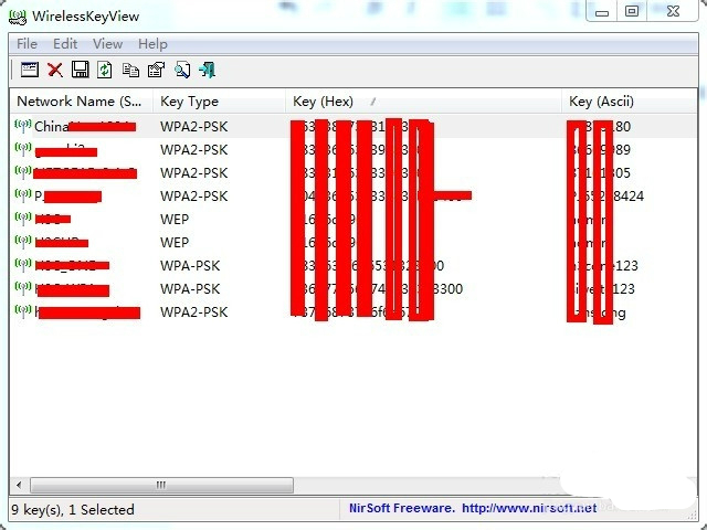 wirelesskeyview中文版是NirSoft出品的一款用于恢復(fù)存儲于Windows XP 系統(tǒng)的"Wireless Zero Configuration"(無線網(wǎng)絡(luò)零配置)服務(wù)和Windows Vista系統(tǒng)的 "WLAN AutoConfig"(無線局域網(wǎng)自動(dòng)配置)服務(wù)中的所有無線網(wǎng)絡(luò)密鑰(WEP/WPA)的工具。它能保存所有的密鑰到文本/HTML/XML文件或單獨(dú)復(fù)制一個(gè)密鑰到剪貼板. 免費(fèi)軟件WirelessKeyView 可免費(fèi)電腦的無線網(wǎng)絡(luò)密碼,能同時(shí)免費(fèi)多個(gè)無限網(wǎng)絡(luò)的密碼,軟件界面最左邊為SSID信號名稱,第四項(xiàng)就是密碼了。