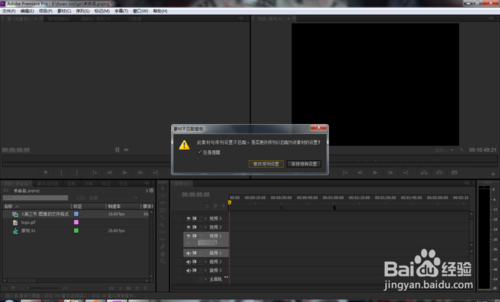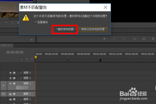 3、把視頻拖放到視頻軌道中,出現(xiàn)這個(gè)對(duì)話框,選擇更改序列設(shè)置