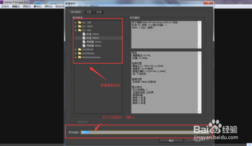 3、然后再新建序列,可以根據(jù)自身需要設(shè)置預(yù)設(shè)和序列名稱。