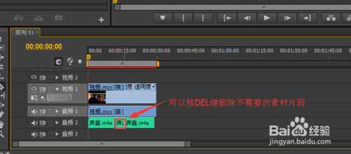 5、放置好素材文件后,可使用左旁的工具編輯素材。如刀片工具,可以用來截取自己想留下的素材部分,按DEL鍵刪除不需要的素材。
