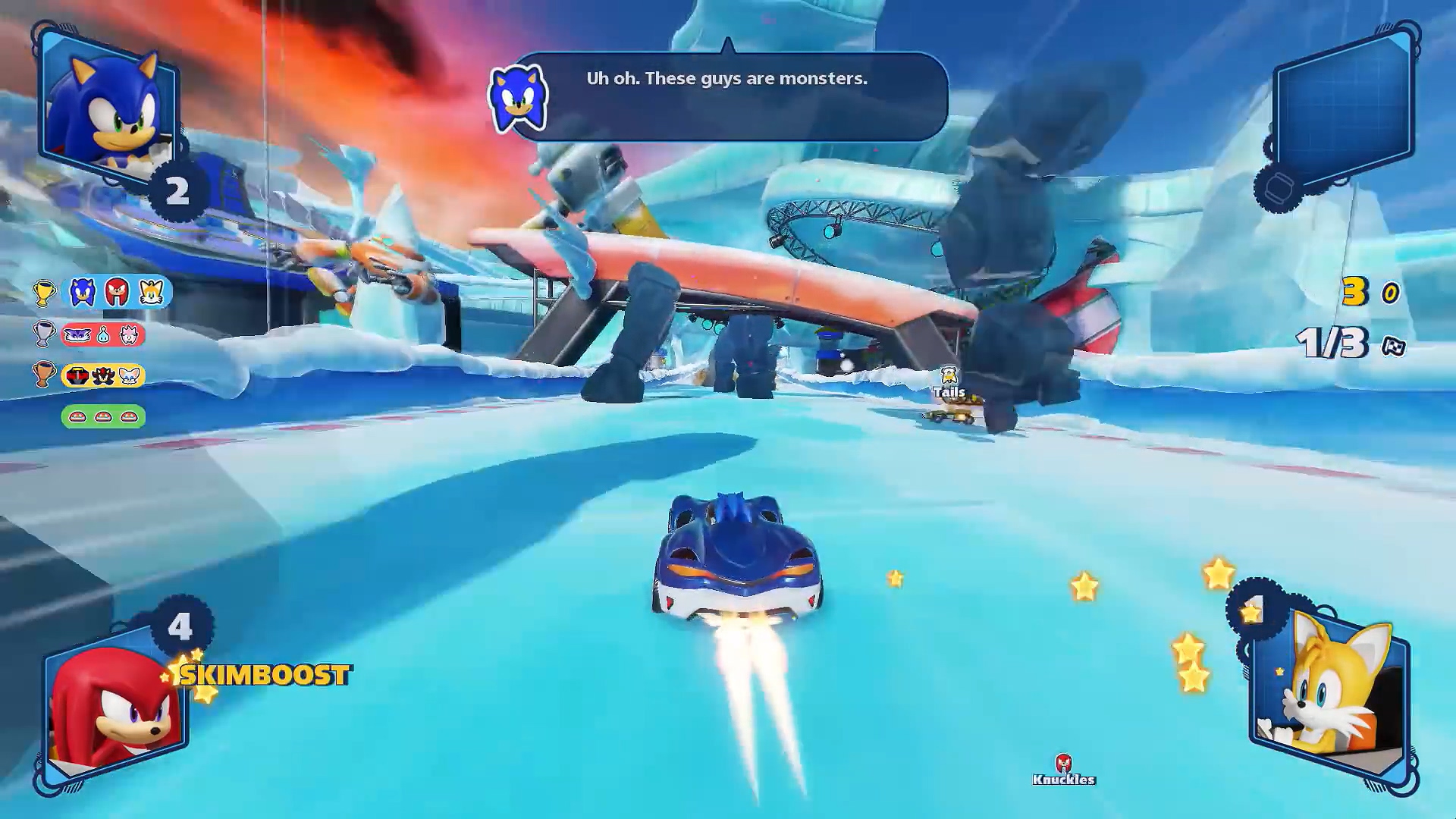 本作除了緊張激烈的游戲機制、令人耳目一新的賽道和妙趣橫生的合作玩法,還包含了故事模式,讓玩家的游戲目標(biāo)也更為清晰了,它利用了索尼克給人“超快速”的印象,每場比賽玩家都可以不斷突破自我,用更短的的時間完成比賽。