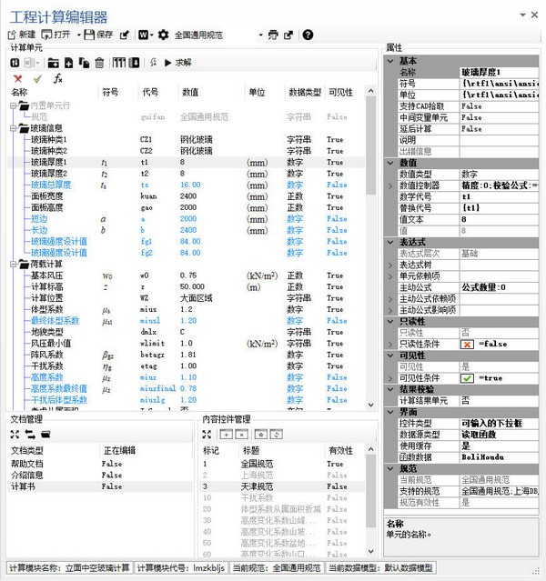 工程計算編輯器借鑒了Excel編寫計算書的思路,一個計算模塊由多個計算單元組成,計算單元之間可以互相引用,更新某個單元時相關(guān)聯(lián)的計算單元全部更新。在借鑒的基礎(chǔ)上,針對工程計算的特點,擴展了Excel所沒有的功能,增強了Excel中比較弱的方面。例如:計算單元不但擁有代號,還可以擁有和規(guī)范書寫方式一摸一樣的數(shù)學(xué)符號和單位。公式不只是簡單的線性公式,而是表達式樹的方式,書寫和維護更方便。計算書的輸出非常靈活,可以根據(jù)各種邏輯生成不同分支的計算書內(nèi)容。計算書的格式是標(biāo)準(zhǔn)的word格式,可以完全使用word內(nèi)置的公式系統(tǒng)。編輯器的總體界面如下,為了編寫計算書時方便和Word互動,選擇了完全嵌入Word的方式: