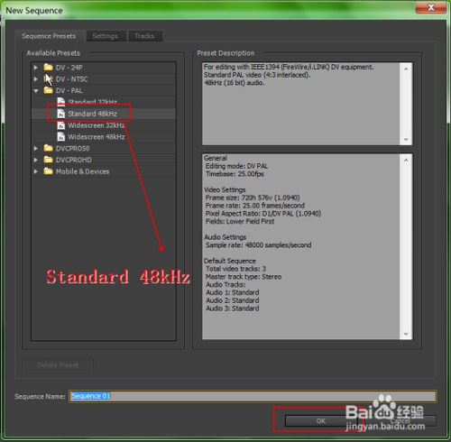 2、在這里我們選擇的是DV_PAL選項下的 Standard 48kHz,選擇的是視頻編碼模式與音頻頻率等,選上之后點擊OK進入下一步。