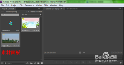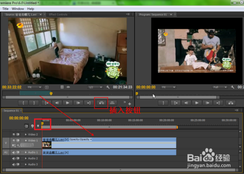 7、把時間線上的滑塊移到開始處,在“源面板上”點擊“插入”按鈕,即可把剛才剪輯的視頻從滑塊處插入,如圖所示。時間線上的進度代表著視頻的進度,把視頻片段插入到時間線開始處,意味著從視頻開始處播放插入的片段。此時如果想進行預覽的話,按下空格鍵,就可以在節(jié)目面板看到效果了。