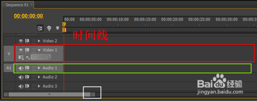 6、這時候,我們來看一下在源面板下方的時間線。Vidoe1表示視頻軌道一,Audio1表示音頻軌道1。我們只要把音視頻分別拖到這里即可。另外需要注意的是:圖中白色方框圈住的地方,按住拖動可以放大或縮小時間線,當剪輯的視頻時間很長時,可以拖動來縮小軌道視圖。
