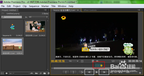 4、雙擊素材面板中《爸爸去哪兒1》,右邊窗口“源面板”便會顯示預覽,在源面板中我們可以進行簡單的視頻剪輯和處理?,F(xiàn)在我們先來看一下“源面板”上的按鈕吧,圈住的分別是入點和出點;而白色方框圈住的是滑塊,代表的是視頻進度。