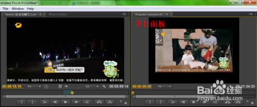10、我們可以在右上角的“節(jié)目面板”進行預覽,預覽的時候有時預覽會很卡,但是導出之后并不會出現(xiàn)卡頓,這只是特殊情況。當然,跟源面板差不多,節(jié)目面板也有微調(diào)按鈕,你可以通過點擊微調(diào)按鈕來逐幀觀察視頻畫面,當要求比較嚴格的時候就需要不斷的微調(diào)了。