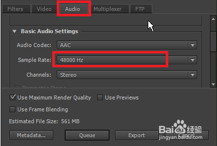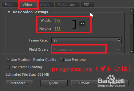 13、在圖1設置視頻參數(shù),盡量設置為跟源素材一樣大小,在數(shù)字上點擊便可以輸入數(shù)值,F(xiàn)ield Rate設置為Progressive,其他保持默認值。在圖2設置音頻參數(shù),音頻頻率要求相同,所以選擇48000kHz。