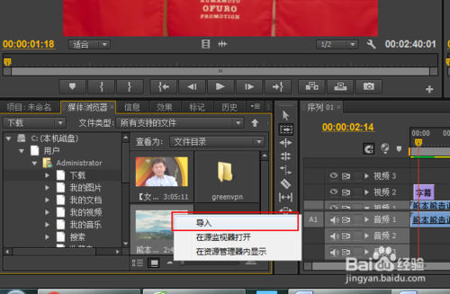 3、我們制作一個實例來講解如何剪輯視頻:我們要制作的是從《爸爸去哪兒1》和《爸爸去哪兒2》各剪一段出來,然后進行拼接。了解剪輯任務之后,我們首先導入視頻到素材面板中:點擊菜單上的File->Import ,選擇要進行剪輯的視頻并點擊導入。
