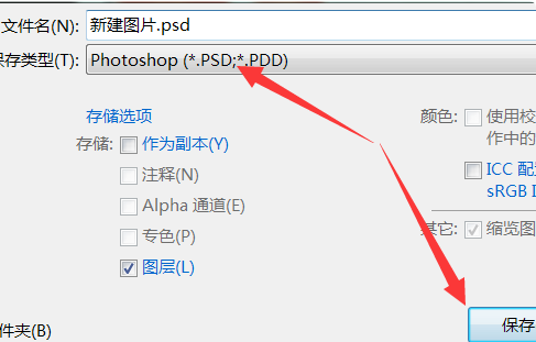 2、即可彈出存儲(chǔ)對(duì)話框,如果需要繼續(xù)編輯該文件,則選擇“PSD格式”,點(diǎn)擊保存。