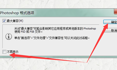 4、在保存時(shí)彈出的“格式選項(xiàng)”對(duì)話框,可以直接點(diǎn)擊“確定”按鈕,如不需顯示,可以勾選“不再顯示”。