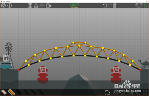 本關(guān)的難點(diǎn)在于跨度較大,有船通過(guò),固定著力點(diǎn)只有2個(gè)。本關(guān)的建造思路也比較單一,基本也就是使用拱橋的建造方法了。
