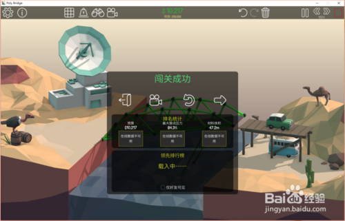 8、點(diǎn)擊開(kāi)始模擬按鈕,測(cè)試通過(guò)結(jié)果如下:預(yù)算9329;壓力25.7%;材料體積37.8(可以看到這次車(chē)輛順利通過(guò),橋梁也沒(méi)有損毀,而且三項(xiàng)數(shù)值都是非常理想的)