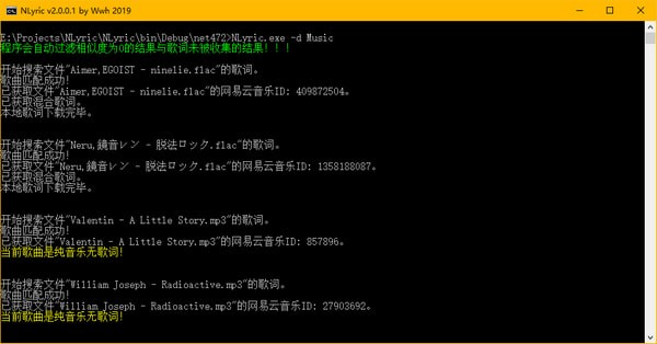 3、輸入命令"NLyric.exe -d 音樂文件夾"