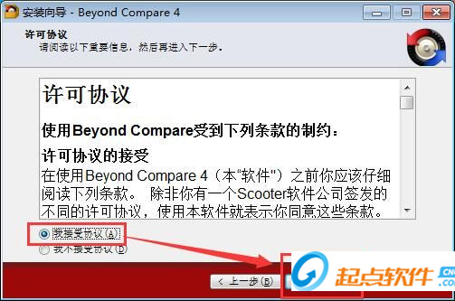 接下來我們要閱讀Beyond Compare的授權(quán)協(xié)議。如果你接受協(xié)議中的條款,點選[我接受協(xié)議]。如果你選定 [取消] ,安裝程序?qū)P(guān)閉。必須接受協(xié)議才能安裝Beyond Compare。點擊[我接受協(xié)議]后點擊[下一步]繼續(xù)安裝;
