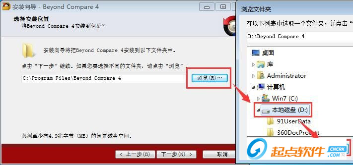 這一步需要我們確定Beyond Compare的安裝路徑,安裝程序有默認(rèn)的安裝路徑:C:\Program Files\Beyond Compare 4。安裝Beyond Compare需要4.9MB的磁盤空間。需要修改路徑的朋友可以點擊[瀏覽],選擇需要安裝的文件夾后,點擊[確定]就可以修改安裝路徑了。點擊[下一步]就可以開始安裝Beyond Compare了;