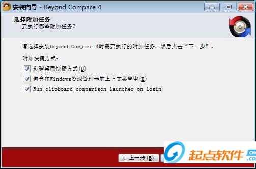 這一步安裝向?qū)б覀冞x擇安裝Beyond Compare期間安裝向?qū)б獔?zhí)行的附加任務(wù),分別是創(chuàng)建桌面圖標(biāo)、包含在Windows資源管理器的上下文菜單中和開機自動啟動Beyond Compar,如果不需要執(zhí)行,將勾選取消即可。點擊[下一步]繼續(xù)安裝;