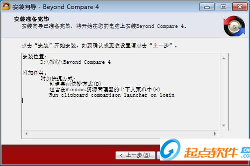 這一步是正式安裝Beyond Compare前的最后一個確認(rèn)步驟,確認(rèn)安裝路徑和附加任務(wù)無誤后,就可以點擊[安裝]將Beyond Compare安裝到電腦上;