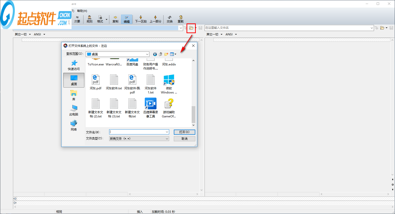 4、用戶點擊左側(cè)窗口“在這里輸入文件夾”一欄的右側(cè)的【文件夾】圖標(biāo),在呼出的“打開文件系統(tǒng)上的文件-左邊”窗口,我們在其中找到并選擇要比較的文本。