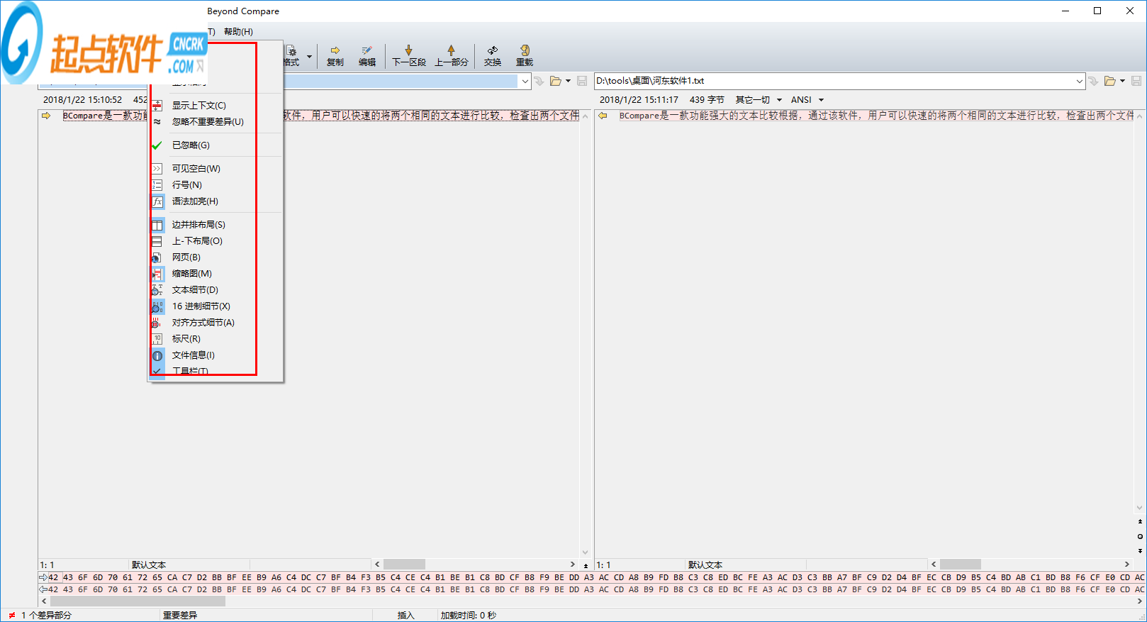 9、另外,用戶可以點擊【視圖】按鈕,然后根據(jù)需要選擇查看的比對的功能,提供了16進(jìn)制細(xì)節(jié)、語法加亮、網(wǎng)頁、對齊方式細(xì)節(jié)等功能。
