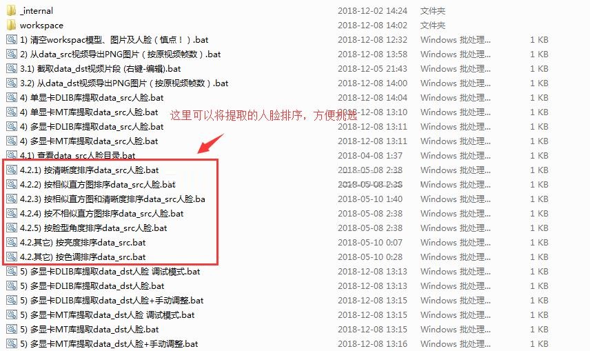 提取好data_src的人臉之后,我們看到下面的批處理是排序,有興趣的同學(xué)可以自己逐個(gè)執(zhí)行看效果,這里我們跳過(guò)。