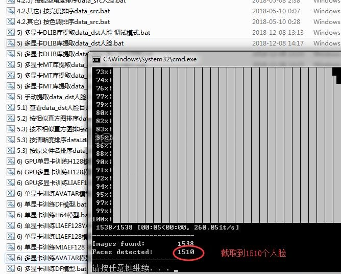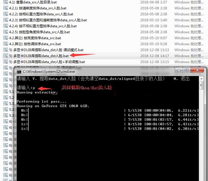 5、同樣的,我們需要提取data_dst的人臉,這里我們也用DLIB來(lái)提取人臉,執(zhí)行批處理開始(雖然命令是多顯卡,但是單顯卡沒(méi)問(wèn)題的)