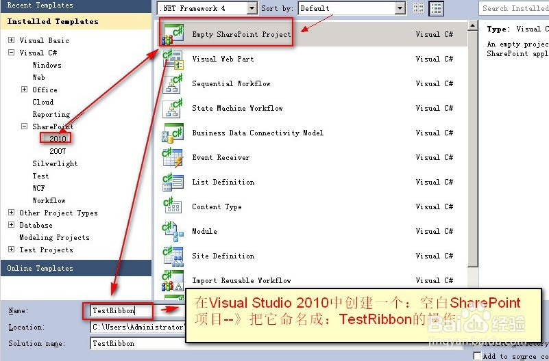 3.在Visual Studio 2010中創(chuàng)建一個:空白SharePoint項目--》把它命名成:TestRibbon的操作
