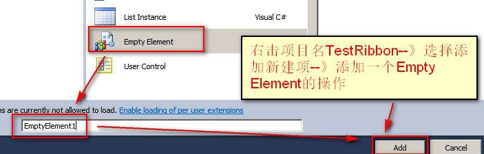 4.右擊項目名TestRibbon--》選擇添加新建項--》添加一個Empty Element的操作