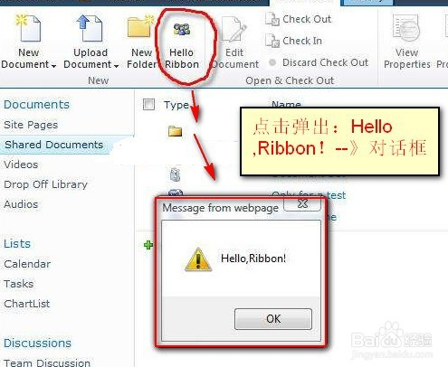 6.點擊彈出:Hello ,Ribbon!--》對話框。