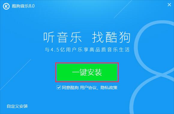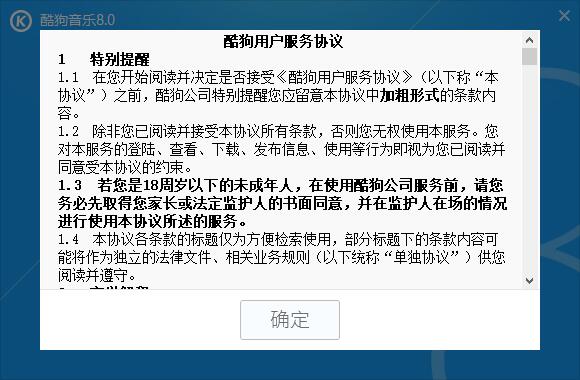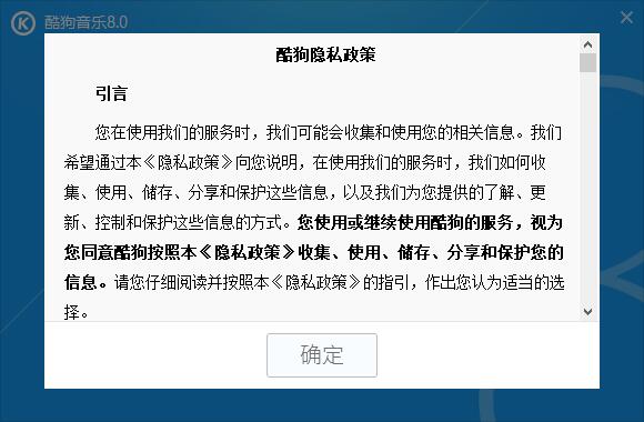 2、進(jìn)入酷狗音樂(lè)安裝程序后,可以點(diǎn)擊界面中間的“用戶協(xié)議”和“隱私政策”進(jìn)行閱讀,建議各位仔細(xì)閱讀,確認(rèn)無(wú)誤后,點(diǎn)擊下方的“確定”按鈕返回主界面。