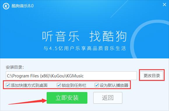 4、或者也可以點(diǎn)擊左下角的“自定義安裝”來(lái)自行設(shè)置,推薦使用自定義安裝。打開(kāi)自定義安裝界面后,先點(diǎn)擊“更改目錄”按鈕選擇酷狗音樂(lè)的安裝目錄,此處不建議安裝在C盤,如果C盤文件過(guò)多的話,會(huì)影響計(jì)算機(jī)的運(yùn)行速度。之后根據(jù)需要選擇是否“添加快捷方式到桌面”、“鎖定到任務(wù)欄”和“設(shè)為默認(rèn)播放器”,確認(rèn)選擇無(wú)誤后,點(diǎn)擊下方的“立即安裝”按鈕即可。