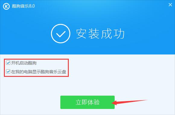 6、安裝結(jié)束后,會(huì)自動(dòng)跳轉(zhuǎn)至安裝成功界面。用戶要根據(jù)習(xí)慣和需要來(lái)選擇是否“開(kāi)機(jī)啟動(dòng)酷狗”和“在我的電腦顯示酷狗音樂(lè)云盤”,如果需要其中某項(xiàng)功能,直接在該項(xiàng)前方的白色方框中點(diǎn)擊勾選即可。